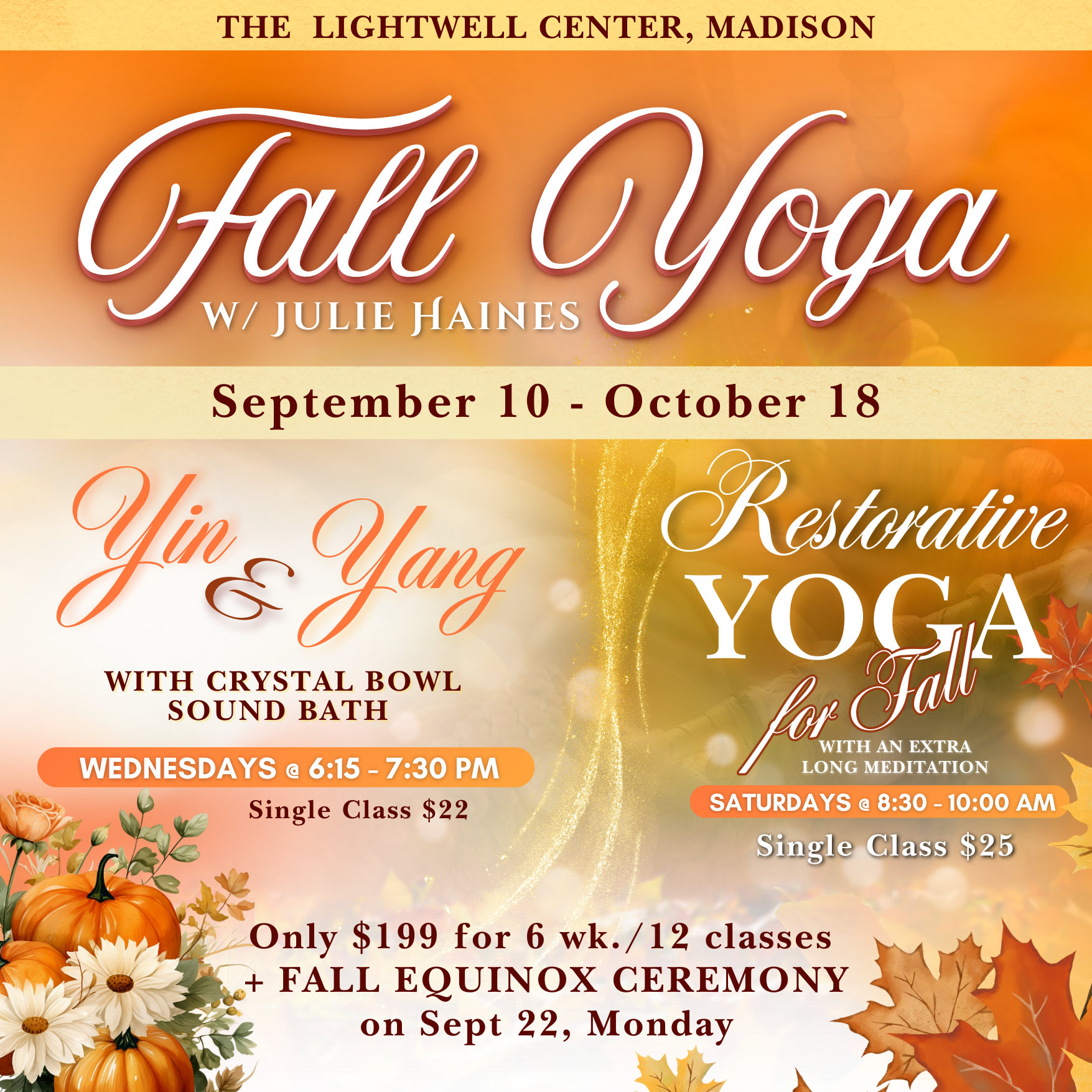 Purchase a Fall Class Pass and enjoy all yoga classes in the 6-week series, plus a special bonus to celebrate the season: on September 22, gather under the stars for a Release Fire Ceremony to honor the Fall Equinox. Guided by Julie, this ceremony is a chance to release what no longer serves you and set intentions for the season ahead. The Fall 2025 Class Pass is just $199, a meaningful way to experience the full energy of fall.
